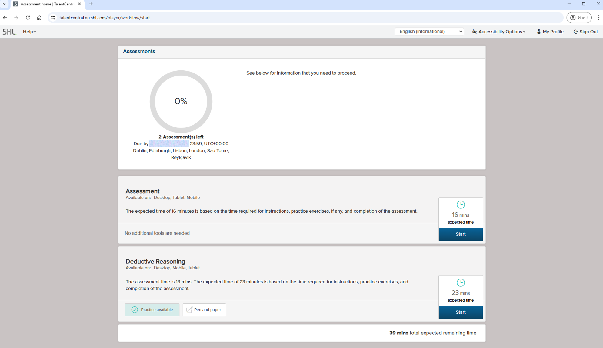 Assessment hub to view your assessments and to start them, here there will be expected details and timing of your assessments. You will be able to confirm choice of language from list made available by SHL.
