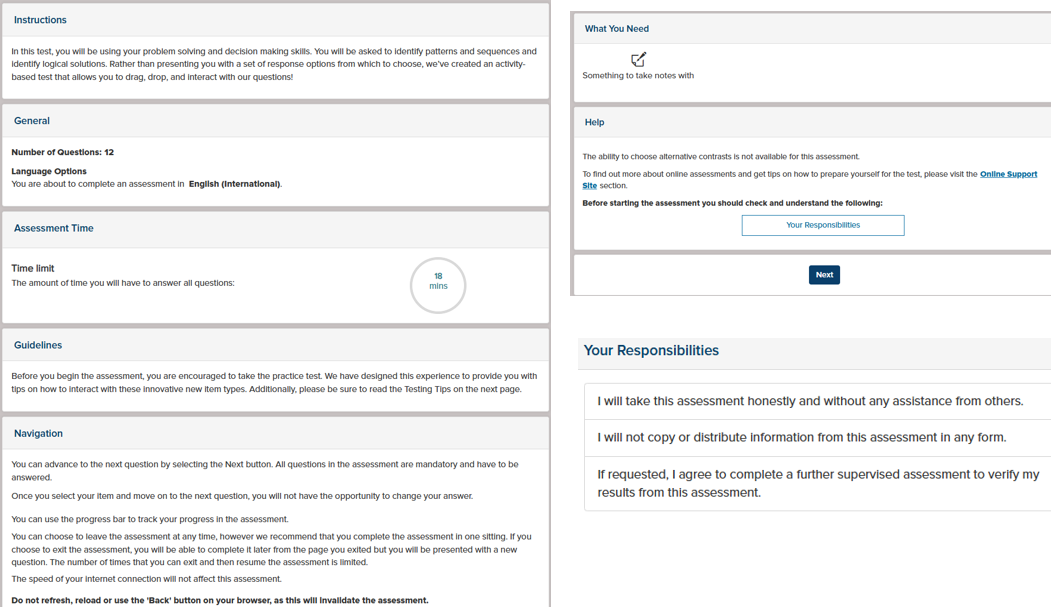 SHL Verify Interactive - Deductive Reasoning assessment guidelines and steps. Once you select start you will have the following on screen images to navigate through during your test.